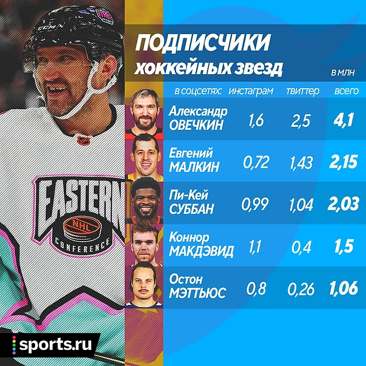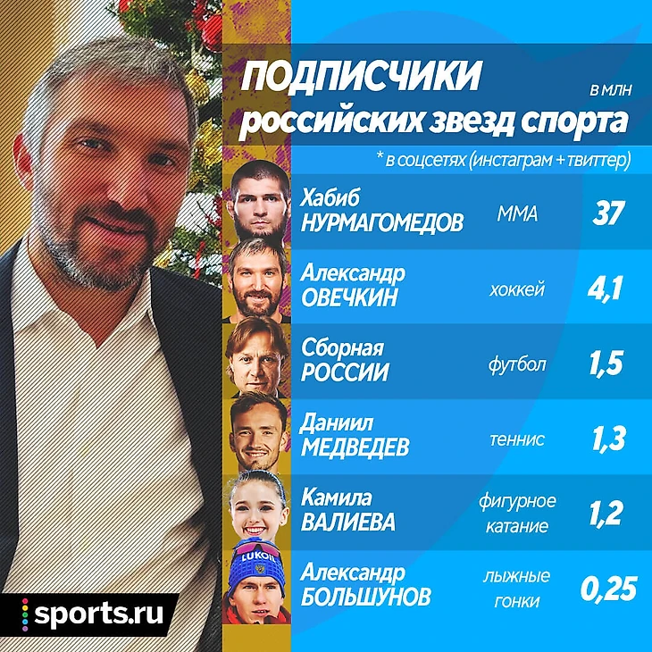 Общее количество подписчиков Овечкина в двух соцсетях выглядит солидно и на фоне российских примеров из других видов спорта:
