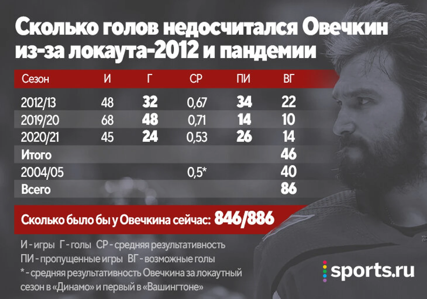 Идем дальше – локаут-2012 и пандемия коронавируса, из-за которых сокращенными получились сразу три сезона. Суммарно в них не были сыграны 74 матча – почти одна полноценная регулярка. Опираясь на результативность Овечкина в тех конкретных чемпионатах, мы прикинули, что он мог бы забросить еще 46 шайб.