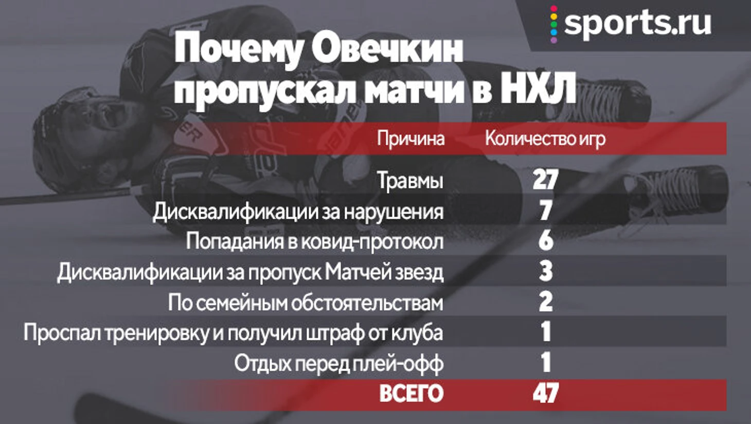 Кстати, у нашей легенды могло быть и больше, чем 800 голов. Из-за травм и дисквалификаций Овечкин пропустил за всю карьеру лишь 47 игр (намного больше у него отняли локауты и пандемия), но даже там причины не всегда были уважительными.