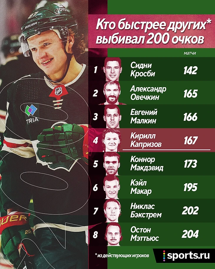 Кириллу же понадобилось 167 игр для достижения отметки – из действующих хоккеистов в лиге быстрее эту цифру пробивали только очень солидные хоккеисты. Теперь к ним в компанию попал Капризов. Самое интересное, что даже Коннор Макдэвид затратили на это больше матчей.