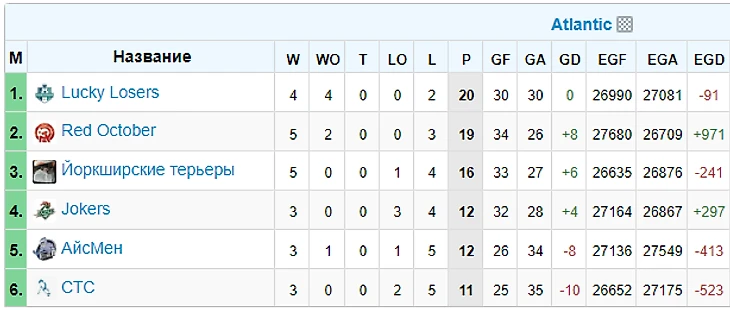 В Атлантическом дивизионе первенствовали Lucky Losers - команда-дебютант, поднявшаяся из АХЛ. Удачно проведя 1й круг, набрав 12 очков, и невзирая на 2 поражения во 2м круге, команда, победив в последнем туре Red October, сумела сохранить первое место. Не имея ярко выраженного лидера, команде удалось выжать максимальный результат.