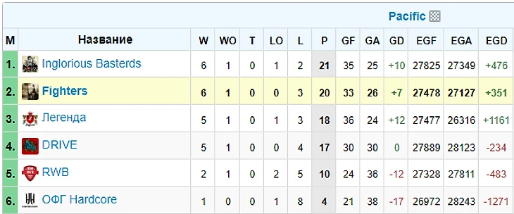 В Тихоокеанском дивизионе победу одержали Inglorious Basterds - команда из года в год показывает стабильно высокие результаты. Арсений Венгер и masara в топ-100. Лишь на очко отстали очень хорошо проведшие 2й круг Fighters. 4 чистые победы - абсолютно лучший результат во 2м круге. Задают тон лидеры команды - Drog и Sevlord, идущие в топ-100.