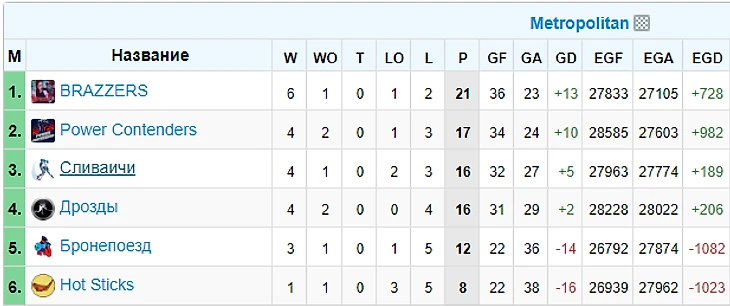 Прилично отстали Hot Sticks, имеющие лишь 8 очков. И хотя во 2м круге команде удалось одержать победу и набрать 5 очков, команда находится в опасной зоне вылета и необходимо хорошо выступить на 2м этапе.