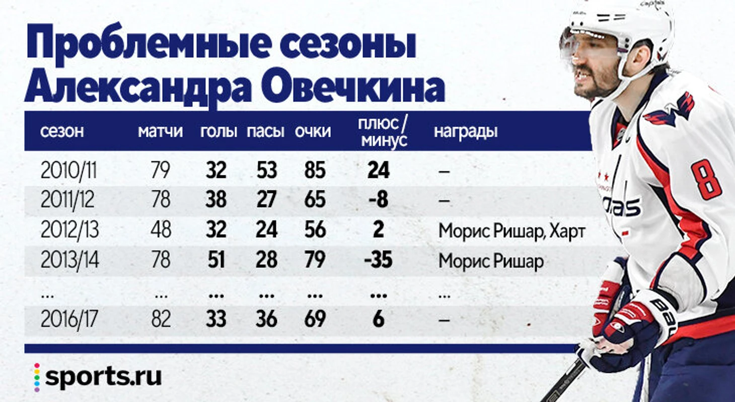 История Овечкина настолько богата на голы, победы и индивидуальные награды, что моменты его игровых спадов сразу же бросались в глаза и становились поводом для обсуждений в духе «уже не тот». А в какой-то момент он вообще был самым критикуемым российским спортсменом и входил в топы переоцененных игроков НХЛ. Эксперты, болельщики, журналисты называли его некубковым, некомандным игроком, которого заботит только собственная статистика. И долгое время Овечкин не мог отбросить навешанные на него ярлыки.