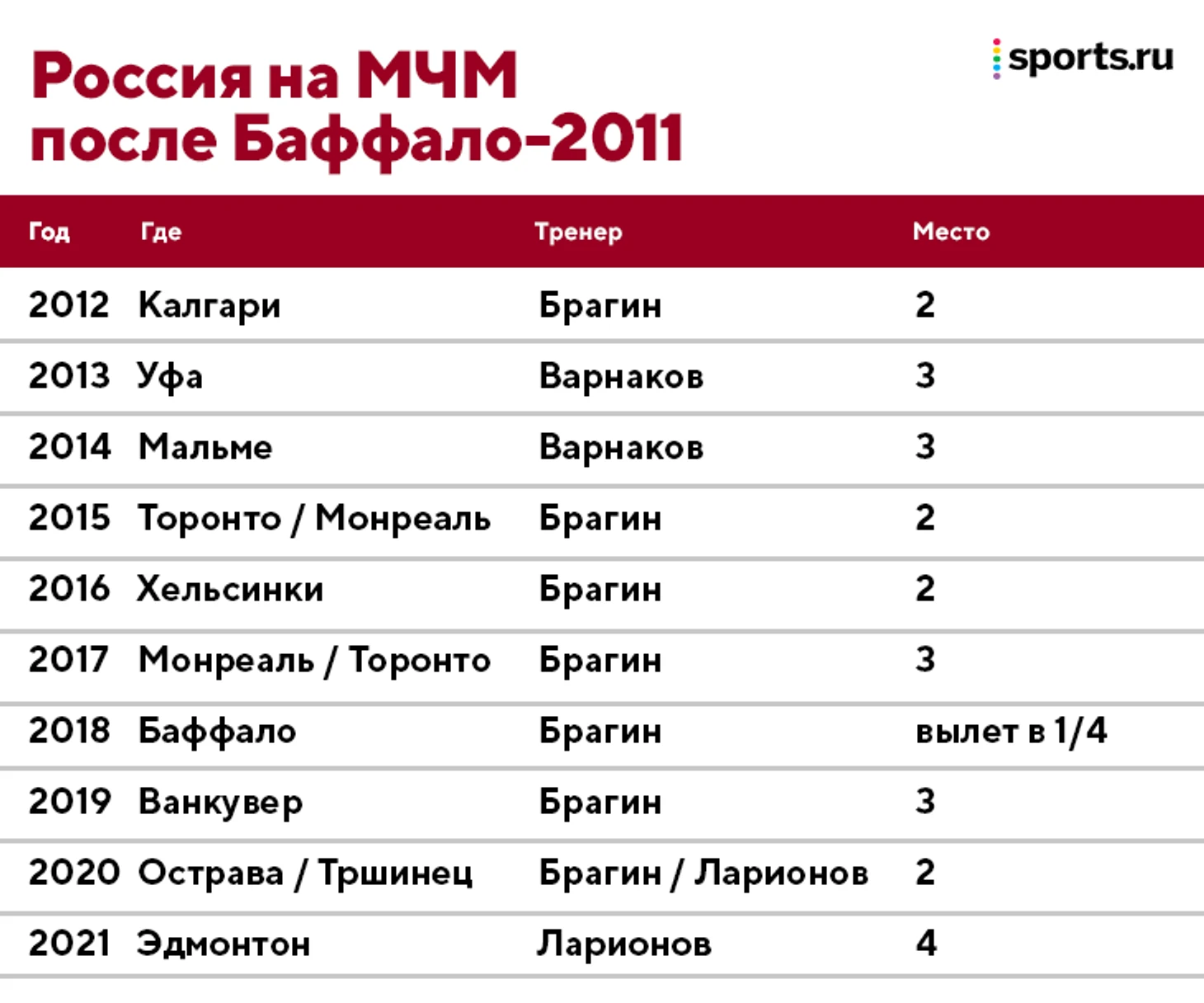 Но у нас остаются и 10 турниров, которые были после Баффало. 10 турниров, 10 сборных, 10 результатов – и среди них ни одного золотого. По инерции бы написать «10 тренеров», но по факту тренеров было три, а по сути – один; в 2010-е молодежку тренировали еще Варнаков и Ларионов, но эти годы точно останутся в истории нашего хоккея как эпоха Брагина.