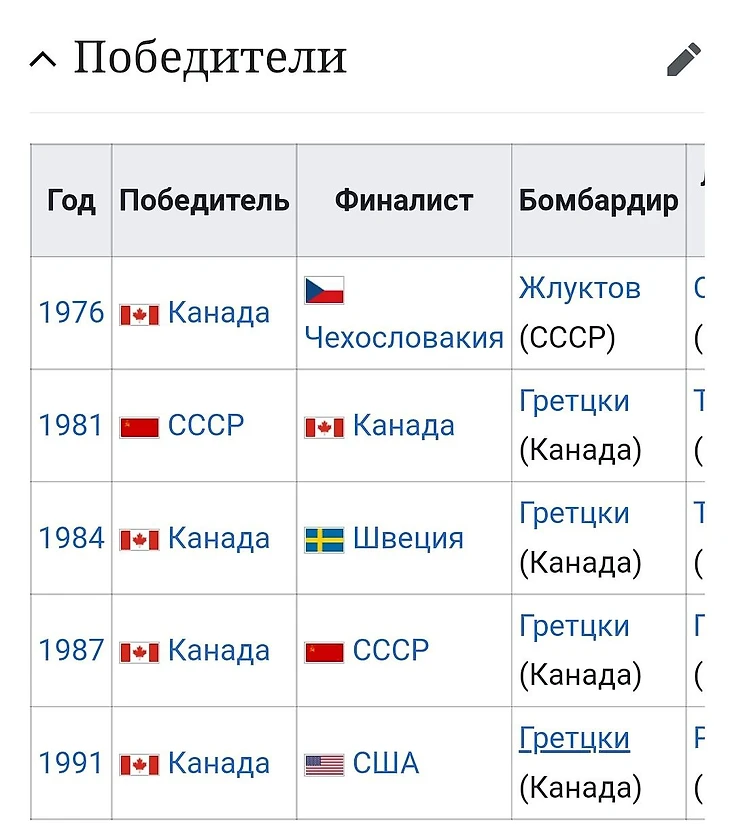 КУБОК Канады\Мира, вот наверное наравне с пятью олимпиадами 1998-2014 ключевые турниры в истории международного хоккея. 5 КК, 3КМ и 5ОИ = 13 ТОП турниров среди всех сильнейших с 1976 по 2016 год. Теперь протрем глаза от сверкания всех медалей СССР/России на ЧМ и ОИ без НХЛ и считаем результаты: 1 золото, безусловно великая победа на Кубке Канады 1981, финал, ну то есть серебро КК-1987, про ОИ напомню серебро-98 и бронза-2002. Все. Канада - 4КК, 2КМ и 3ОИ. Выводы делайте сами. А как там Гретцки?