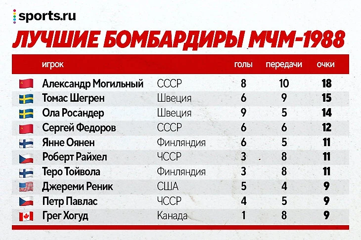 Сергей Федоров с 12 очками стал четвертым бомбардиром турнира, а Александр Могильный – первым с 18. Этот результат и сейчас входит в десятку лучших за всю историю МЧМ. Уже следующий сезон Могильный начал в НХЛ, сбежав из ЦСКА, а еще через год в Северную Америку убежал и Федоров.