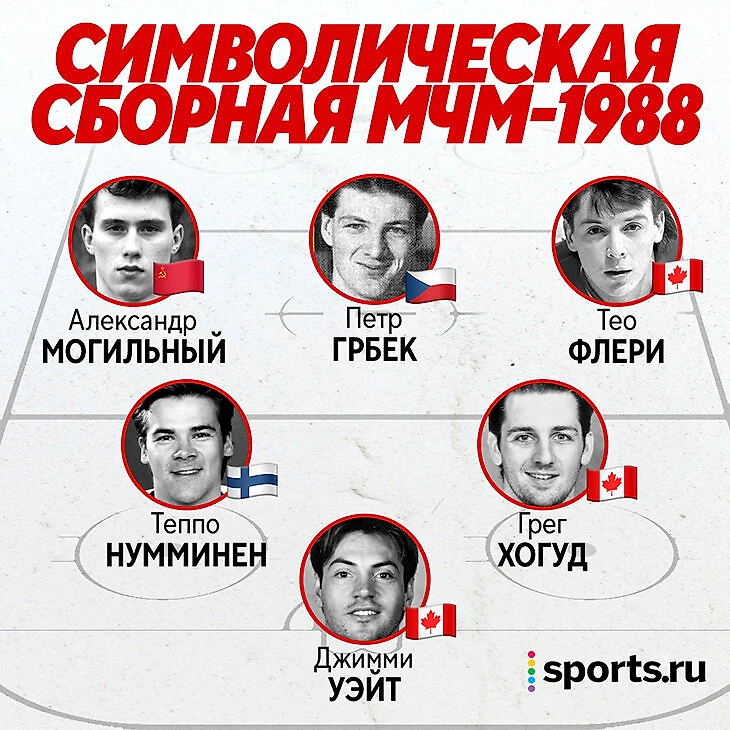 Но и у чемпионов герои были неожиданные. В то время как за канадцев выступали Джо Сакик, Теорен Флери, Тревор Линден, Марк Рекки, Адам Грэйвс, Эрик Дежарден, лучшим бомбардиром стал защитник Грег Хогуд. Больше всех пострадав в Пьештянах (Владимир Константинов сломал ему нос), он сполна отыгрался в Москве и вошел в символическую сборную турнира. Хотя МЧМ-1988, наверное, был пиком его карьеры – в НХЛ он играл очень нестабильно и провел всего 474 матча.