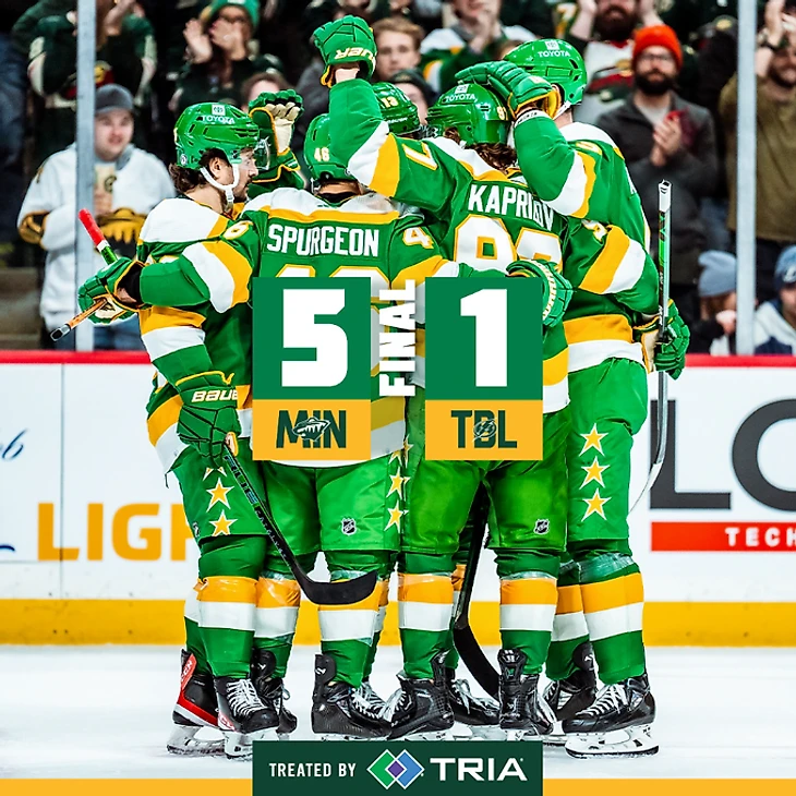"Миннесота Уайлд"-"Тампа-Бэй Лайтнинг" 5:1.Каллен Эддисон набрал 3 очка (1+2),Кирилл Капризов забросил 2 шайбы,Мэтт Болди отдал 2 результативные передачи,Филип Густафссон отразил 34 броска.У гостей Никита Кучеров отдал результативную передачу.
