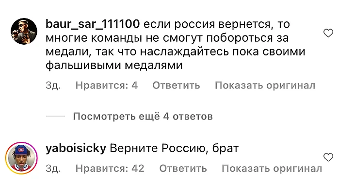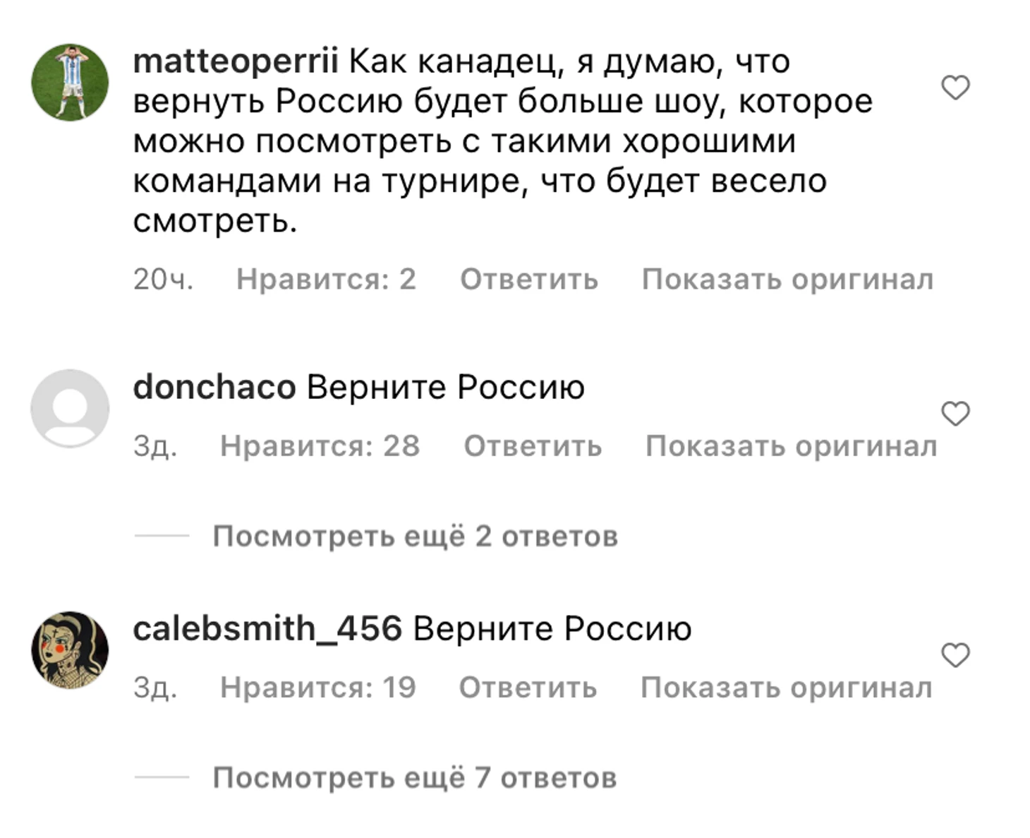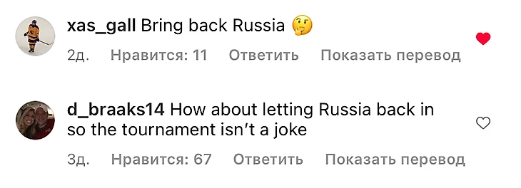 Как болельщик сборной России и ценитель честного спорта, я хочу выразить благодарность всем комментаторам, которые просят вернуть Россию. Нельзя смешивать все в одну кучу со спортом, мы хотим смотреть зрелищный и захватывающий хоккей между сильнейшими сборными планеты.