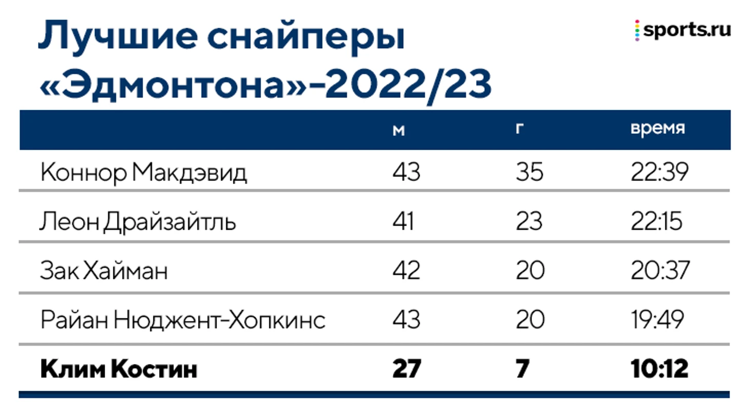 Безусловно, у Клима не самые выдающиеся показатели, да и про травмированного Кэйна стоит помнить, но при том айстайме, что получает русский нападающий – хорошие цифры. Понятное дело, что ставка в атаке в «Ойлерс» в первую очередь делается именно на Макдэвида – с которым, кстати, Костина уже ставили в одно звено, но с Нюджент-Хопкинсом и Янмарком пока выходит куда лучше – 7 голов и 4 передачи.