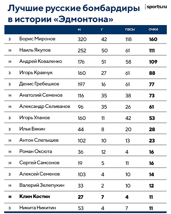 А в январе выдал яркое признание фанатам: «Болельщики — самое важное в нашем виде спорта. Все, что мы делаем, — для болельщиков. Я очень рад, что они любят меня, и я хочу, чтобы они знали, что я люблю их больше, чем они меня». Кажется, он идет к тому, чтобы стать любимым русским полевым в истории «Ойлерс».