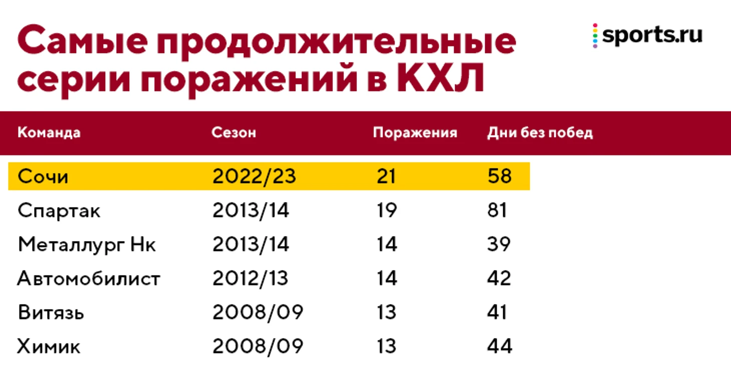 Но главное для него – первая победа после долгой и мучительной серии поражений. Худшей в истории КХЛ. Да и нашего хоккея вообще – ХК «Сочи» обошел даже СКА времен суперлиги, у которого был антирекорд в 20 поражений подряд