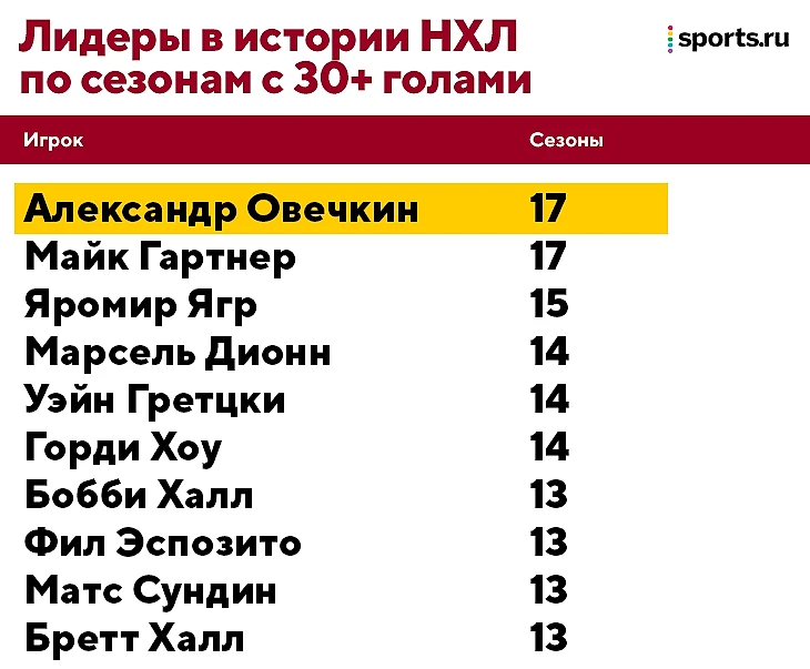 И даже если нападающий в итоге не догонит канадца (хотя в это уже слабо верится), то все равно останется в истории. Овечкин – единственный игрок, которому принадлежат рекорды по количеству сезонов с 50, 40 и 30 голами, пусть в некоторых он пока и делит лидерство.