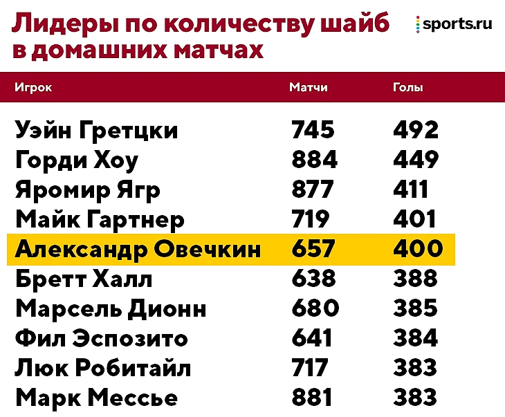 Еще один юбилей – сегодняшняя шайба для Ови стала 400-й на домашнем льду. По этому показателю он пока пятый в лиге, но четвертого – Гартнера – подвинет уже через пару шайб. Рекорд здесь тоже у Гретцки, и, что удивительно, Алекс быстрее доберется до отметки в 894 шайбы, чем до этого достижения.