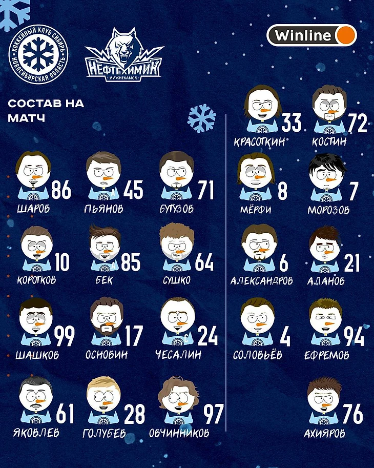 Кто сказал, что игроки вообще сегодня будут нужны? В составе на матч вместо лиц хоккеистов были их «снеговиковые» версии (больше напоминающие, правда, героев «Южного парка»).