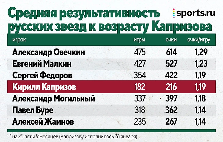 Да, он приехал в лигу позже своих соседей по списку, поэтому, возможно, стоит смотреть не столько число игр, сколько возраст: какую среднюю результативность имели наши к нынешним годам Капризова – 25 лет и 9 месяцев?