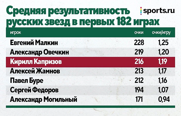 Дебют Капризова в НХЛ – на уровне суперзвезд. По статистике в первых 182 матчах он уступает только Малкину и совсем чуть-чуть Овечкину. Все остальные – позади.
