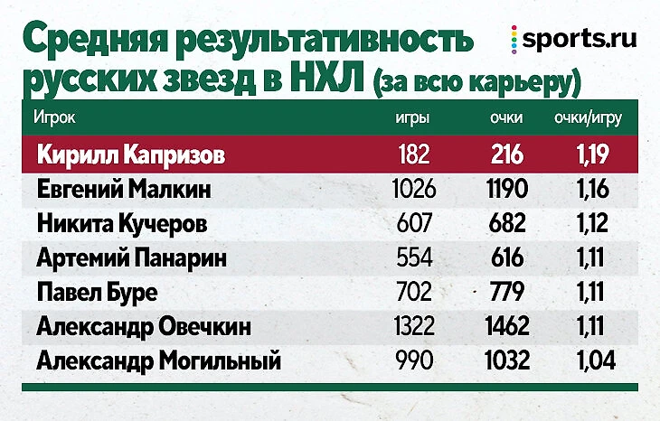 Это может показаться удивительным, но Кирилл Капризов по средней результативности – лучший русский бомбардир в истории НХЛ. Понятно, что сыграл он пока не так много и находится, в отличие от конкурентов, на самом пике (об этом мы еще поговорим), но то, что Капризов – уже один из лучших русских игроков лиги всех времен, можно считать фактом.