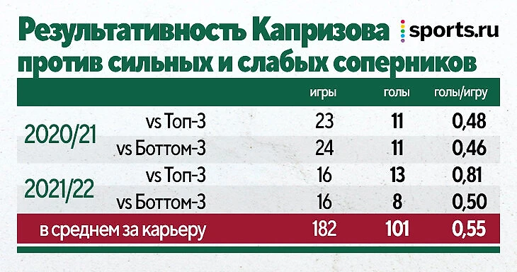 Глядя на статистику, мы можем добавить: сильным соперникам Кирилл забивает даже чуть больше, чем слабым (пока не берем этот сезон, потому что топ-3 и боттом-3 еще могут меняться, и цифры в сравнении с прошлыми сезонами не будут легитимны).