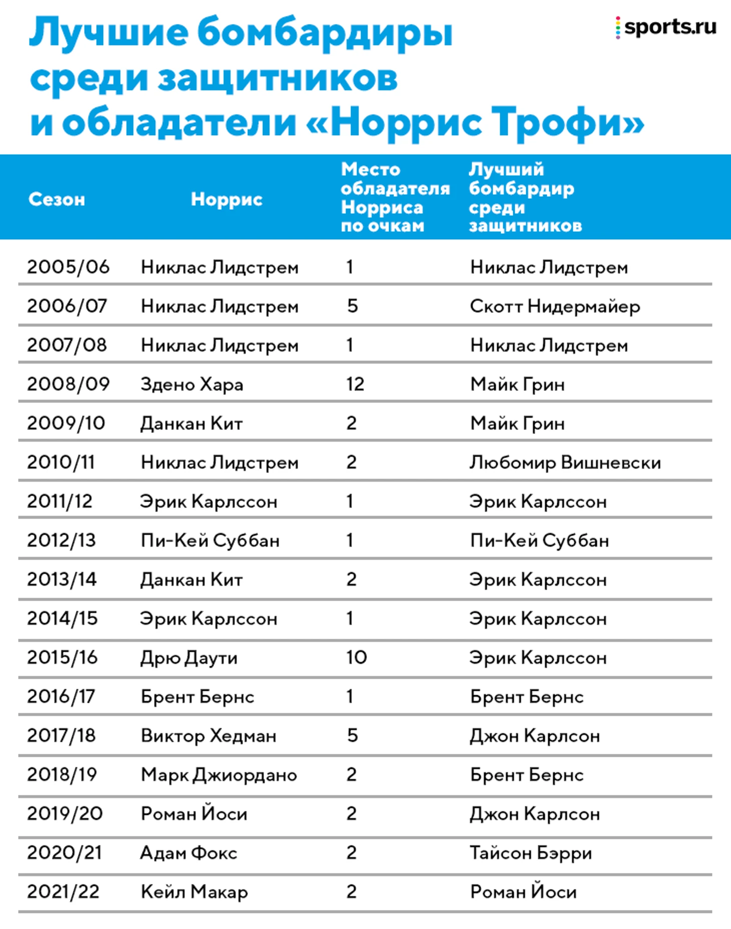 Но Карлссон в этом сезоне может замахнуться и на третий «Норрис». Правда, шансов у него не так много, как кажется. Вопреки распространенному мнению, самый результативный защитник получает «Норрис» не так уж часто. Например, за последние десять лет – только трижды.