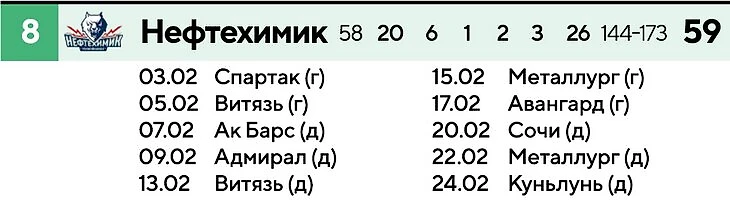 У Нижнекамска – сладкий календарь на февраль. Понятно, что все матчи взять не получится, но последняя домашняя серия против потерявших мотивацию «Сочи» и «Куньлуня» и хаотичной «Магнитки» делает «Нефтехимик» фаворитом гонки. Главное – что-нибудь в гостях зацепить, а то по сезону с этим туго.