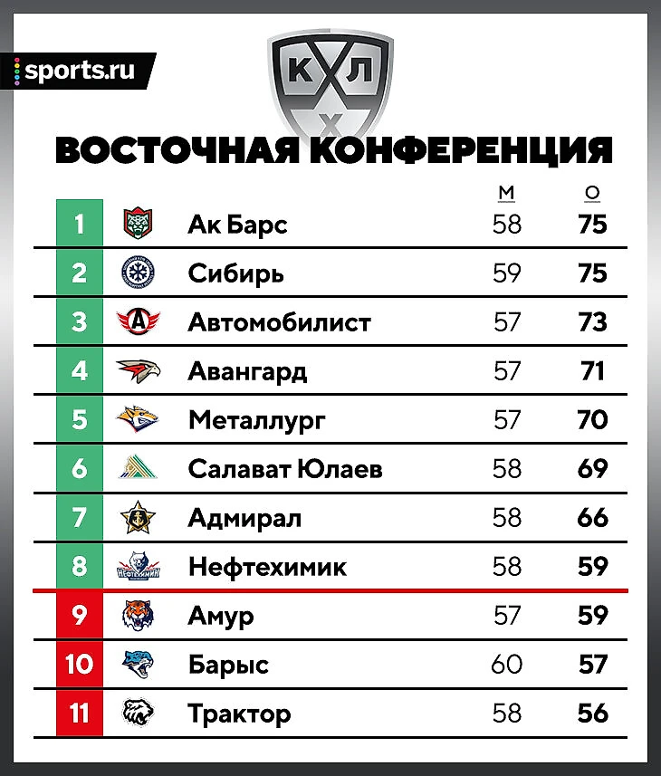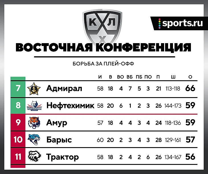 Плотность команд восхищает – все четыре последних могут занять восьмое место. Не исключено, что в последний день регулярки придется смотреть на дополнительные показатели, а при равенстве очков в первую очередь решают победы в основное время. Тут преимущество у «Барыса», но при равенстве он все равно уступит «Нефтехимику» – уже из-за побед в овертаймах.