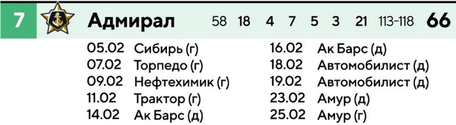 Не такое уж простое расписание, но, по сути, с 12 февраля команде не надо никуда летать – можно методично убирать соперников, ловящих джетлаги, во Владивостоке. Плюс у «Адмирала» заметное преимущество по очкам перед отстающей группой – чтобы его растерять, нужно просто развалиться.