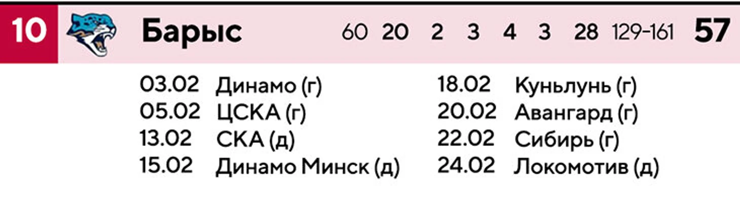 У «Барыса» ситуация непростая: он провел больше матчей, но идет предпоследним. С учетом ближайших соперников к следующей домашней игре команда вообще может крепко отстать. В феврале матчей в Астане будет мало – и это проблема: из уже сыгранных 29 матчей в гостях выиграли только 10. Слишком слабо, чтобы зацепиться за плей-офф.