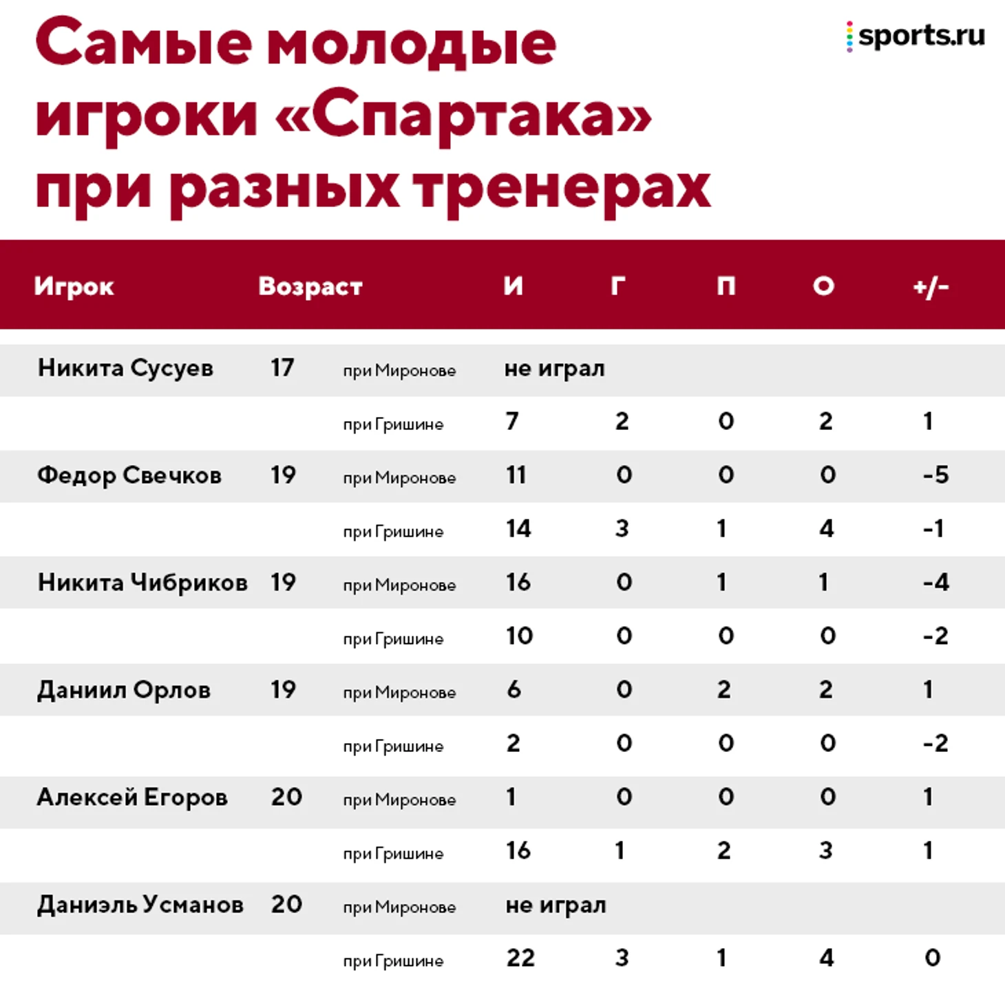 После отставки Миронова «Спартак» выиграл 9 из 10 матчей, в том числе 8 из 9 уже непосредственно с Гришиным. И все это – при большом количестве молодых игроков, которых новый тренер сразу стал активно привлекать к основе.