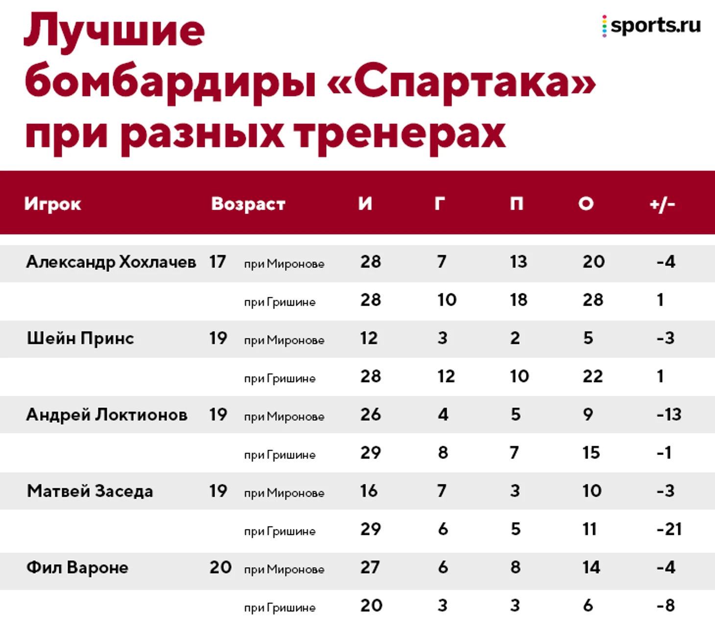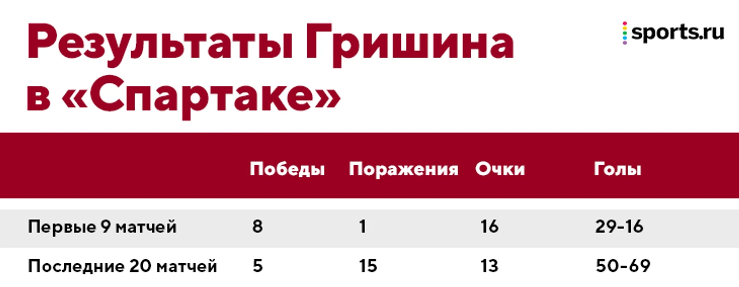 Сложно сказать, что именно сломалось у «Спартака»: не было ни длинного перерыва, ни массовой потери лидеров. Да и от руководства вроде бы полная поддержка. «Гришина брали, чтобы он работал. Он давно в структуре «Спартака», работал с «Химиком», а как будет после сезона – давайте доживем до этого», – говорил советник председателя наблюдательного совета клуба Алексей Жамнов.
