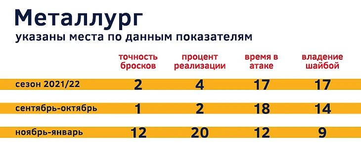 Команда стала больше владеть шайбой, но это приводит не к увеличению числа опасных моментов, а к ошибкам и голам в свои ворота. Против плотной обороны все меньше шайб доходит до чужих ворот, поскольку соперник их с легкостью блокирует, реализация бросков закономерно падает. Без свободного пространства не получается использовать свой козырь в виде быстроты форвардов, но создавать это пространство должен сам «Металлург».
