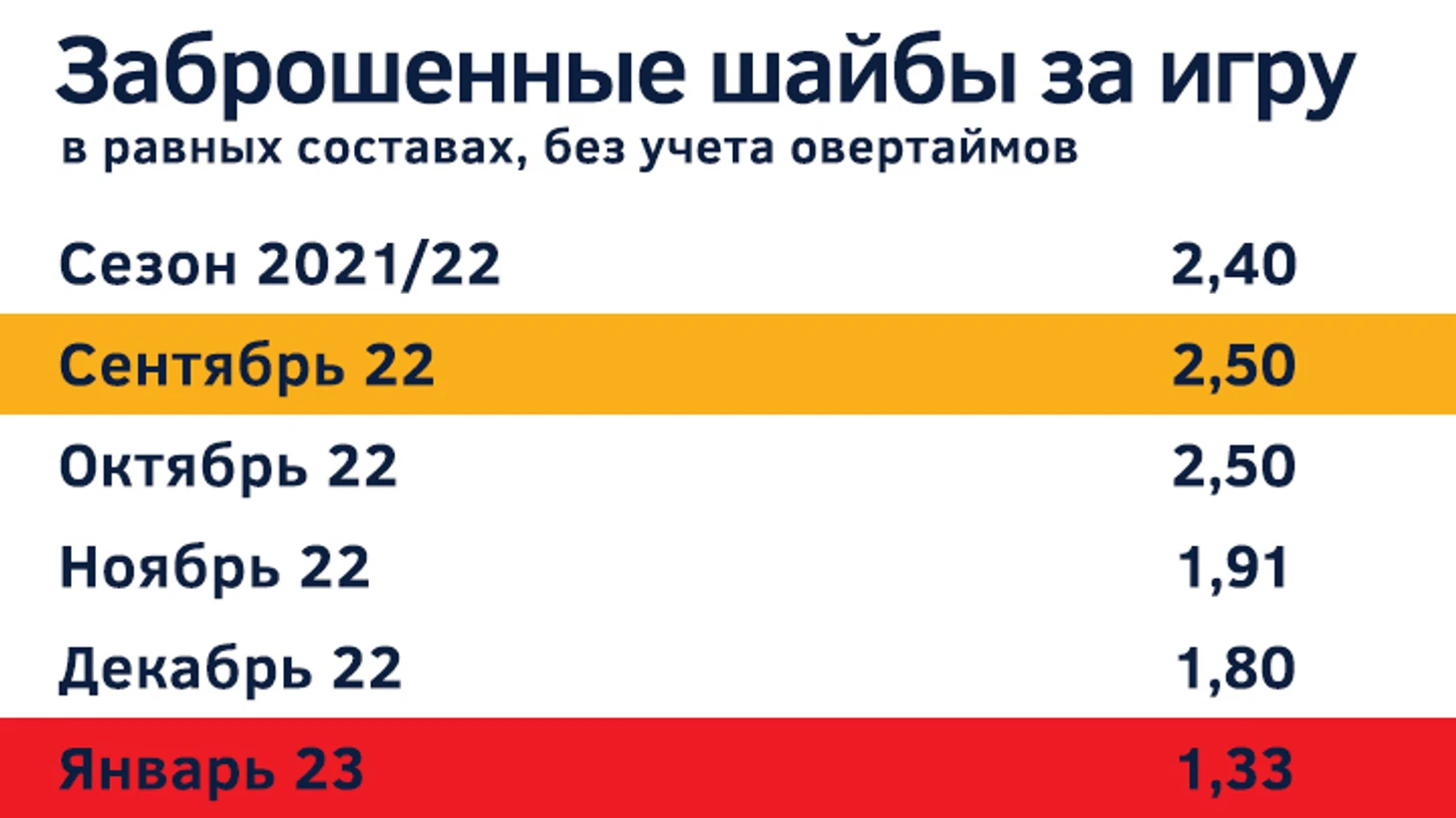 Вопреки прогнозам Чибисова, в январе большинство никуда не пошло, а наоборот – процент реализации упал еще сильнее. И это только полбеды, «Металлург» все меньше и меньше заставляет соперников нарушать правила. В первом месяце нового года «Магнитка» имела всего по 2,1 попытки большинства за матч в среднем – это абсолютно худший показатель среди всех команд лиги. Если команда со скоростными и техничными форвардами с трудом зарабатывает большинство, значит явно что-то идет не так.