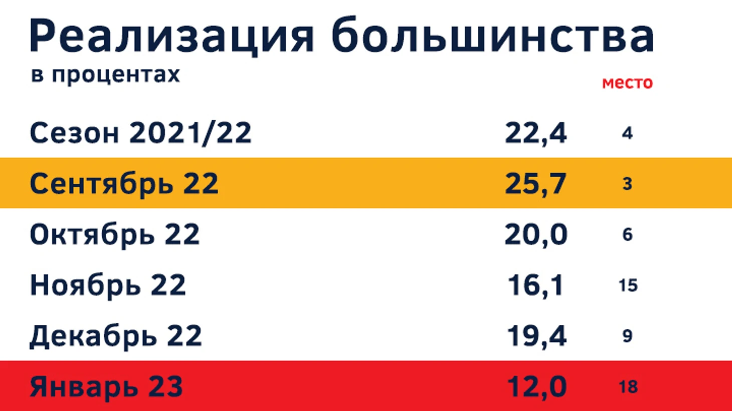 «Пока что у нас не идет большинство. В прошлом сезоне получалось намного лучше. В этом не получается довести шайбу до ворот и логического завершения. Дело в исполнении, везении. Шайба где-то должна отскочить, чтобы большинство пошло. Одну забьем – и все потихоньку поедет», – так рассказывал о проблемах с реализацией Андрей Чибисов в конце декабря.