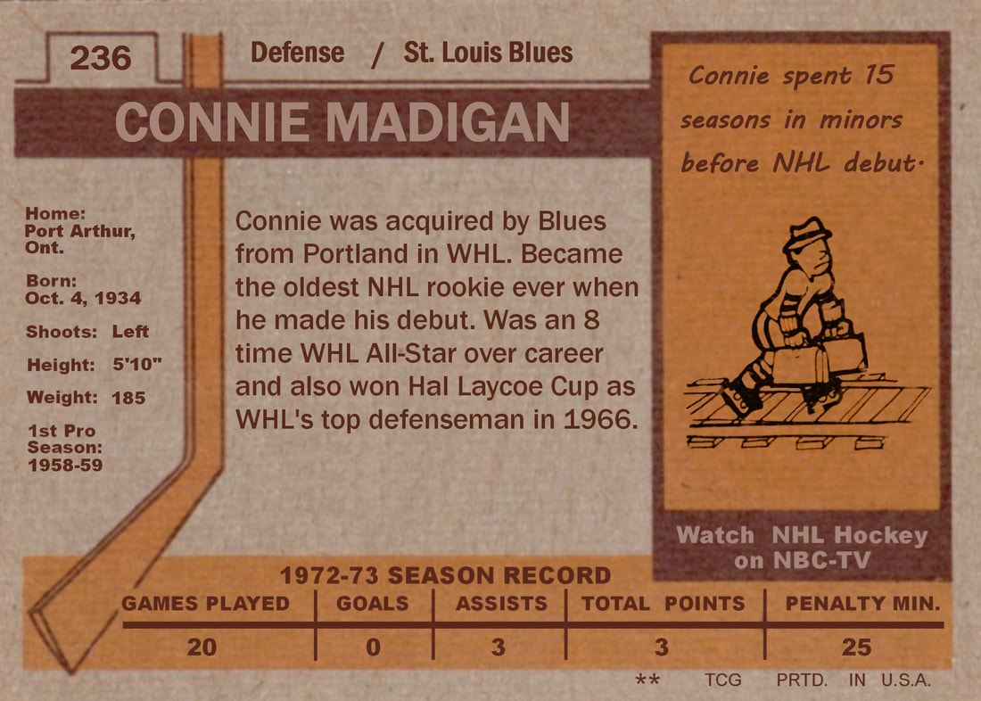 50 лет назад, шестого февраля 1973-го, в НХЛ, в составе «Сент-Луис Блюз», дебютировал защитник Конни «Mad Dog» Мэдиган.
