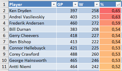 Среди остальных вратарей, одержавших минимум 200 побед, есть несколько человек с более серьёзным процентом.
