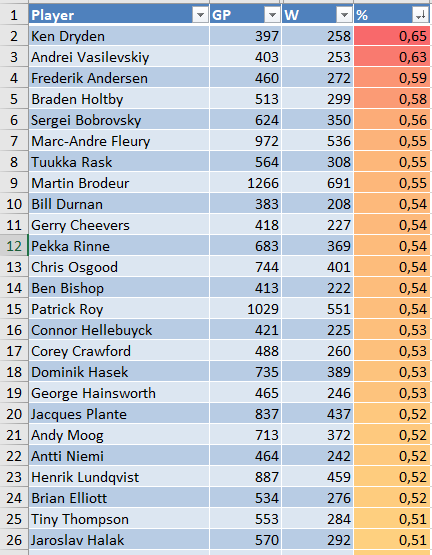 Топ-25 среди вратарей, одержавших минимум 193 победы (первые 100 игроков в рейтинге).