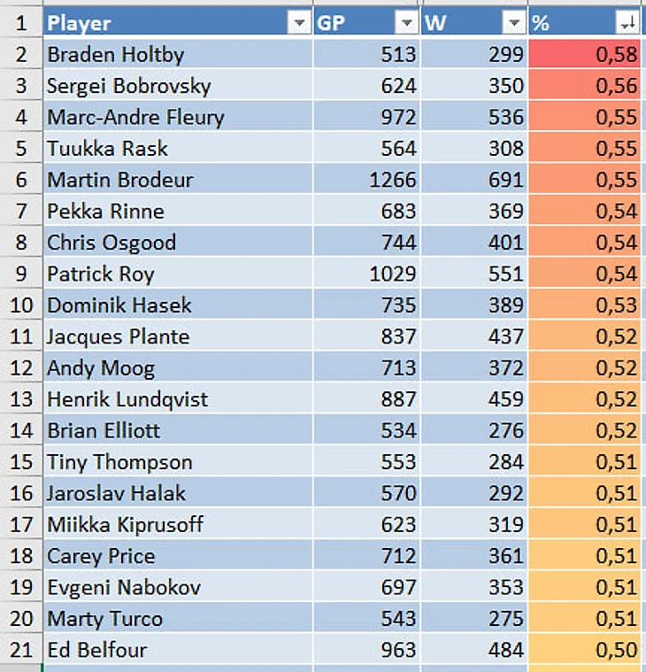 Нужны цифры где Бродо первый и так далее по списку, а не Холтби во главе с 299 победами
