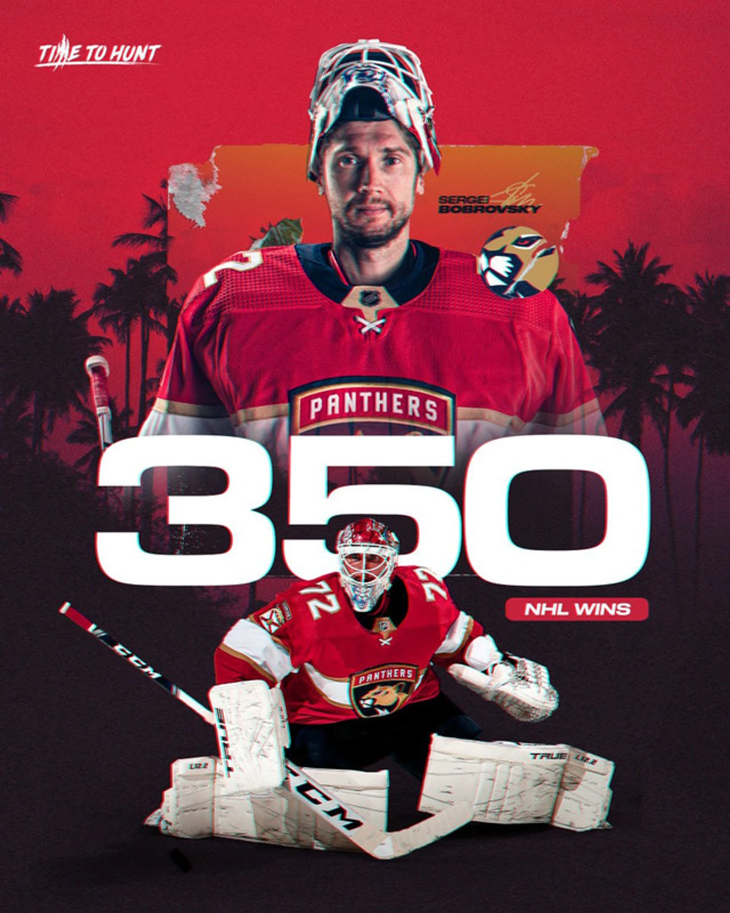 Прошедшей ночью «Флорида» победила «Сан-Хосе» со счётом 4:1, а Бобровский одержал 350-ю победу в карьере, на это ему потребовалось 624 игры. Учитывая тот факт, что Бобровский никогда не играл в топ-клубах, не считая «Флориды», которую до этого сезона можно было отнести к таковым на протяжении последних двух лет, это очень крутой показатель.