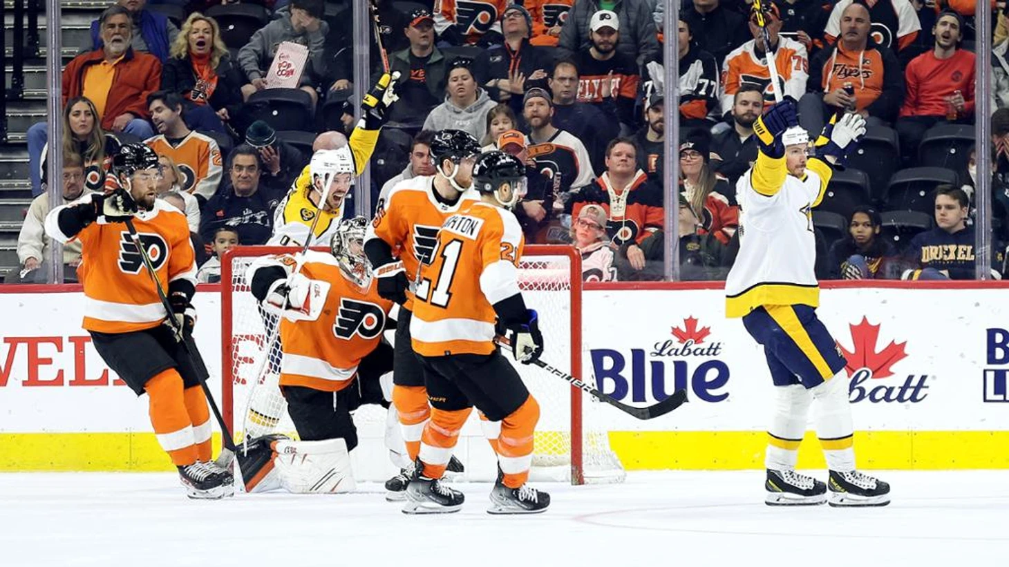 "Филадельфия Флайерс"-"Нэшвилл Предаторз" 1:2 (ОТ).Мэтт Дюшен в овертайме принёс победу гостям.Мэтт Дюшен набрал 2 очка (1+1),Юсе Сарос отразил 23 броска.Во втором периоде Николя Делорье подрался с Таннером Жанно.