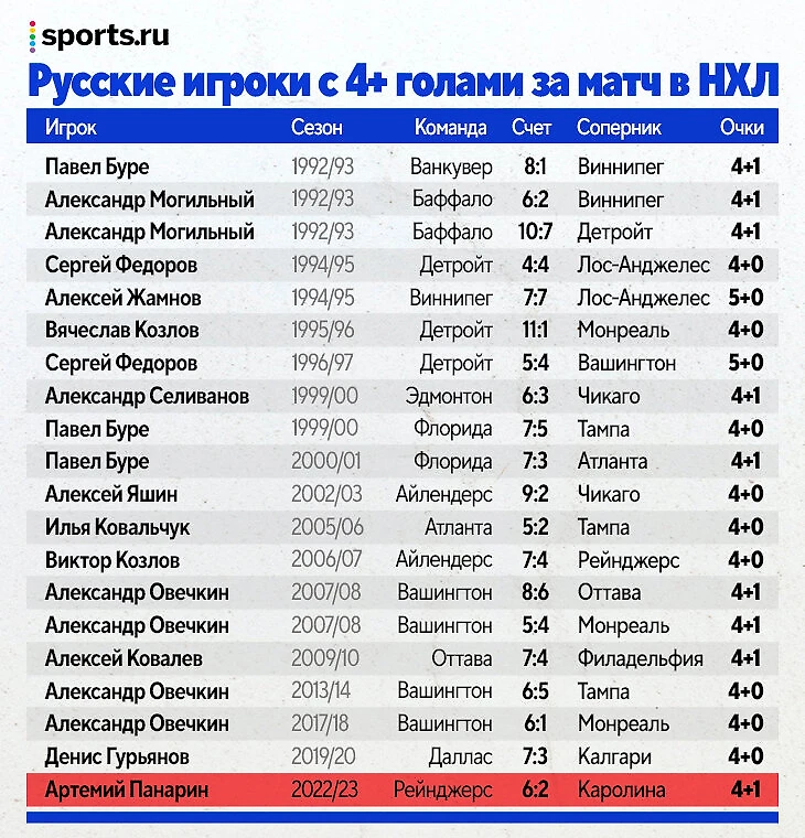 За всю историю НХЛ Панарин 13-й русский игрок с 4+ голами за игру. В этом списке выделяются Павел Буре с тремя покерами и два исторических пента-трика, которые исполнили Сергей Федоров и Алексей Жамнов.
