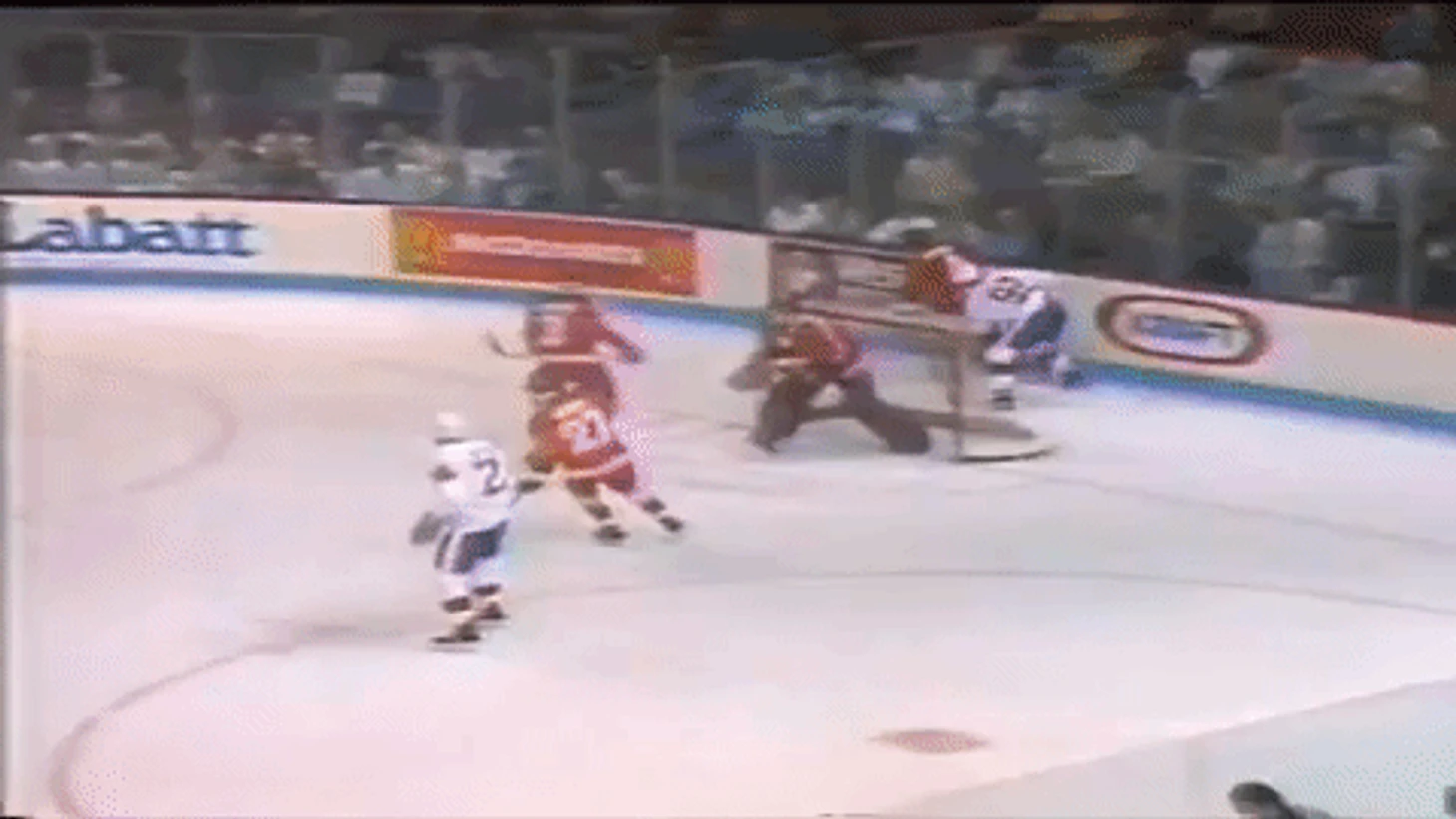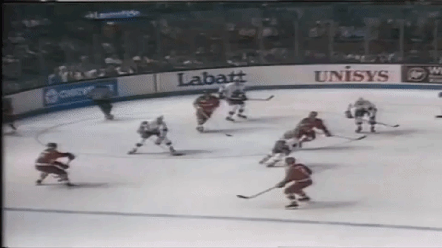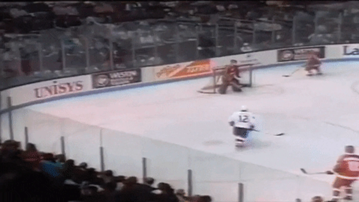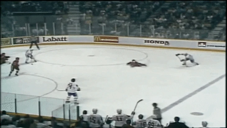 Гретцки же тем временем затаился на левом краю во время развития атаки. Когда же Бурк бросил, 99-й покатил на ворота. На полпути он понял, что шайба пролетит мимо створа и не попадет в ближний угол – тогда Гретцки изменил свой маршрут и покатил в то место, куда игровой снаряд должен был отскочить от лицевого борта. Он успел вовремя, и пусть даже его бросок получился неидеальным, шайба все равно оказалось в сетке, поскольку Мыльников откровенно проиграл в позиции.