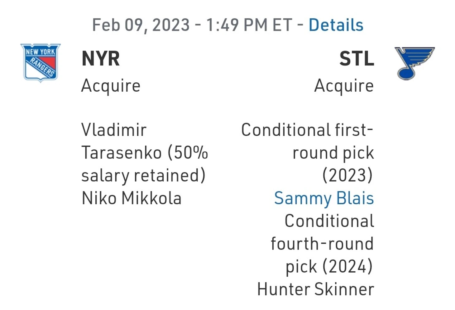 Сделка состоялась 9 февраля, и в результате этого обмена стан Нью-Йоркской команды пополнили: Владимир Тарасенко, 50% зарплаты которого удерживает Сент-Луис, а также финский защитник Нико Миккола. В обратном направлении проследовали: вернувшийся в родную команду Сэмми Блей, проспект Хантер Скиннер, выборы в первом раунде драфта 2023г и в 4 раунде 2024г.