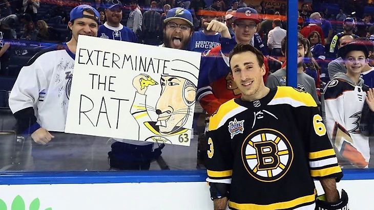 Грязная игра Маршанда стала его настоящим кредо. Причём не стоит отождествлять Брэда с известными костоломами. В том-то и дело, что Маршанд славился жесткими и грубыми силовыми приемами только в начале карьеры, ведь в противном случае его бы отождествляли с каким-нибудь другим зверем. Но кличка, прицепившаяся к Маршанду, останется с ним даже после окончания его карьеры – крыса! Причём в Северной Америке его даже чаще называют не «rat», а «pest» - это общее обозначение некоего вредителя или паразита, слово «пестициды» как раз пошло от него. Маршанд к своей кличке уже привык и даже абсолютно её не отрицает. Например, может сфотографироваться с оскорбительным для себя плакатом болельщика соперника. «Уничтожьте крысу» - гласил баннер фанатов «Тампы». А вот другой креатив от болельщиков «молний» - «Эй, крыса, оближи это». Был ещё простенький баннер от фанов «Ванкувера» - «выглядит как крыса, играет как крыса». В общем, количество вариаций таких артов зашкаливает – доходит даже до обыгрывания темы крысиного короля. Это стараются уже сами болельщики «Бостона». «Если вы не болеете за «Брюинс», мы прекрасно понимаем, за что вы ненавидите Маршанда», - говорят они. На самом деле, даже сам Маршанд не отрицает, что такую манеру игры он выработал ещё в юношеском возрасте, когда его скромные габариты не позволяли ему успешно играть против высоких и крепких ровесников. Также Брэд упоминал, что в этом плане идеалом такого маленького негодяя был Клод Лемье. А уж про его выходки мы на канале рассказывали не раз: бросок на разминке по чужим воротам, силовой на Крисе Дрейпере и прочие грязные вещи.