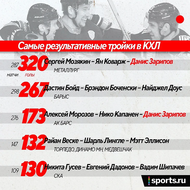 В 2022 году КХЛ рассказывала о самых результативных тройках в истории лиги. Все они уже давно разбиты, и лишь несколько игроков продолжают карьеру в России. Данис Зарипов – единственный, кто появляется в списке дважды и с разными партнерами. Связку в «Ак Барсе» там дополняет легионер Капанен, в «Металлурге» – Коварж.