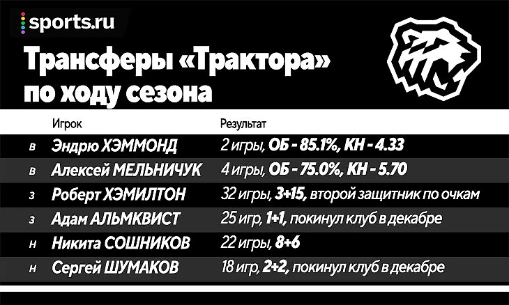 По факту, нормально зашли два новичка из шести: защитник Роберт Хэмилтон стал важной частью большинства, набрал 18 очков и стал вторым среди защитников по очкам и полезности. Плюс неплохо вписался Никита Сошников (к нему еще вернемся ниже) – у него 14 очков в 22 матчах, и по средней результативности он второй в команде после Антона Бурдасова.