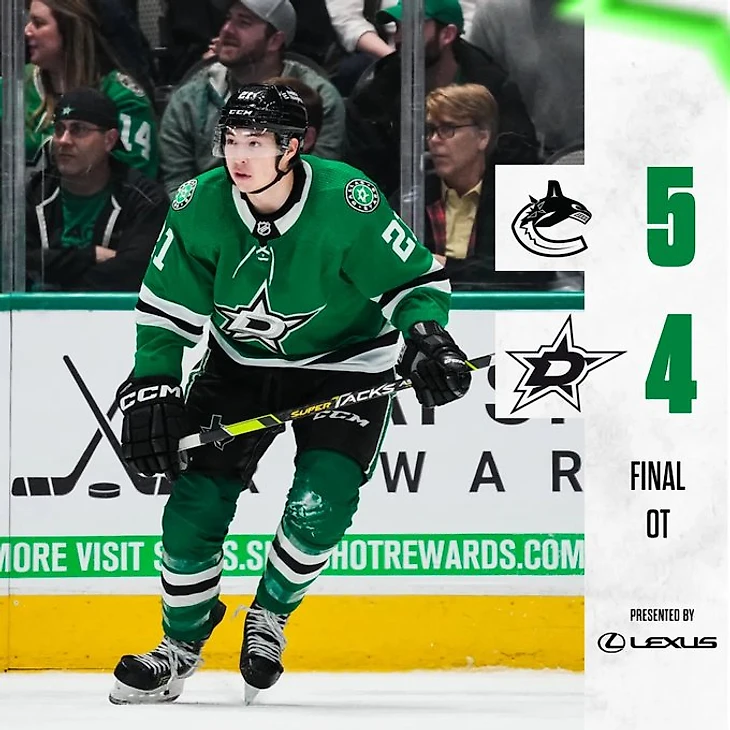 "Даллас Старз"-"Ванкувер Кэнакс" 4:5 (ОТ).Андрей Кузьменко в овертайме принёс победу гостям.Антуан Бовилье набрал 3 очка (2+1),Андрей Кузьменко также набрал 3 очка (1+2),Куинтин Хьюз отдал 3 результативные передачи,Василий Подколзин забросил одну шайбу,Тэтчер Демко отразил 34 броска.У хозяев Джейми Бенн набрал 2 очка (1+1),Евгений Дадонов забросил одну шайбу.