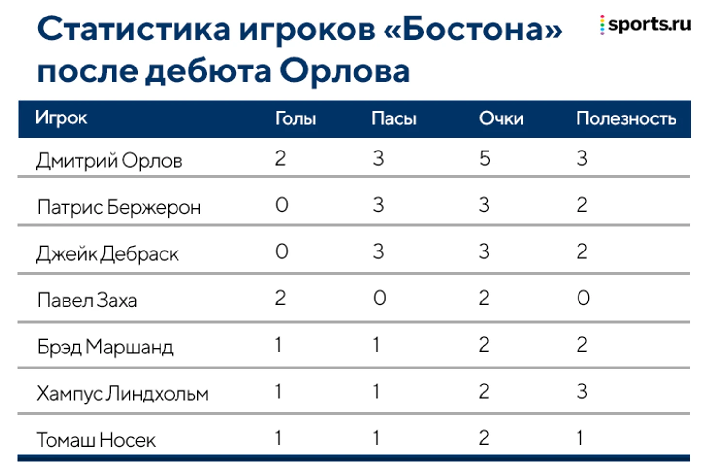 Забавно, но если брать отсчет с момента дебюта Орлова, то прямо сейчас он лучший бомбардир «Брюинс». Даже у Бержерона на два очка меньше, плюс у канадца нет голов в последних трех играх. С новым защитником бостонцы выиграли пока все матчи, хотя всего семь игроков (включая Орлова) набрали больше одного очка за этот отрезок.