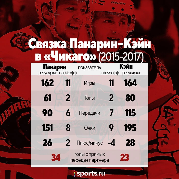 Два из четырех самых результативных сезонов Кэйн провел рядом с Панариным, причем оба раза эта парочка занимала две первые строчки в командной гонке бомбардиров. Тот случай, когда партнеры прокачивают друг друга, а не кто-то один играет в подыгрыше у другого, и статистика это только подтверждает.