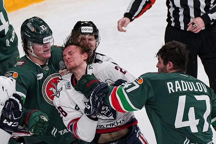 Возникла массовая стычка, в ходе которой все разбились на пары – и самая яркая схватка получилась у Чивилева и Радулова: нападающий «Ак Барса» сцепился с соперником, заборол его, уложив на лед, но на этом все не закончилось. Оба игрока резко поднялись и продолжили вольную борьбу, Чивилев снял с противника шлем, но на нем повис Воронков, что позволило Радулову нанести мощный удар.